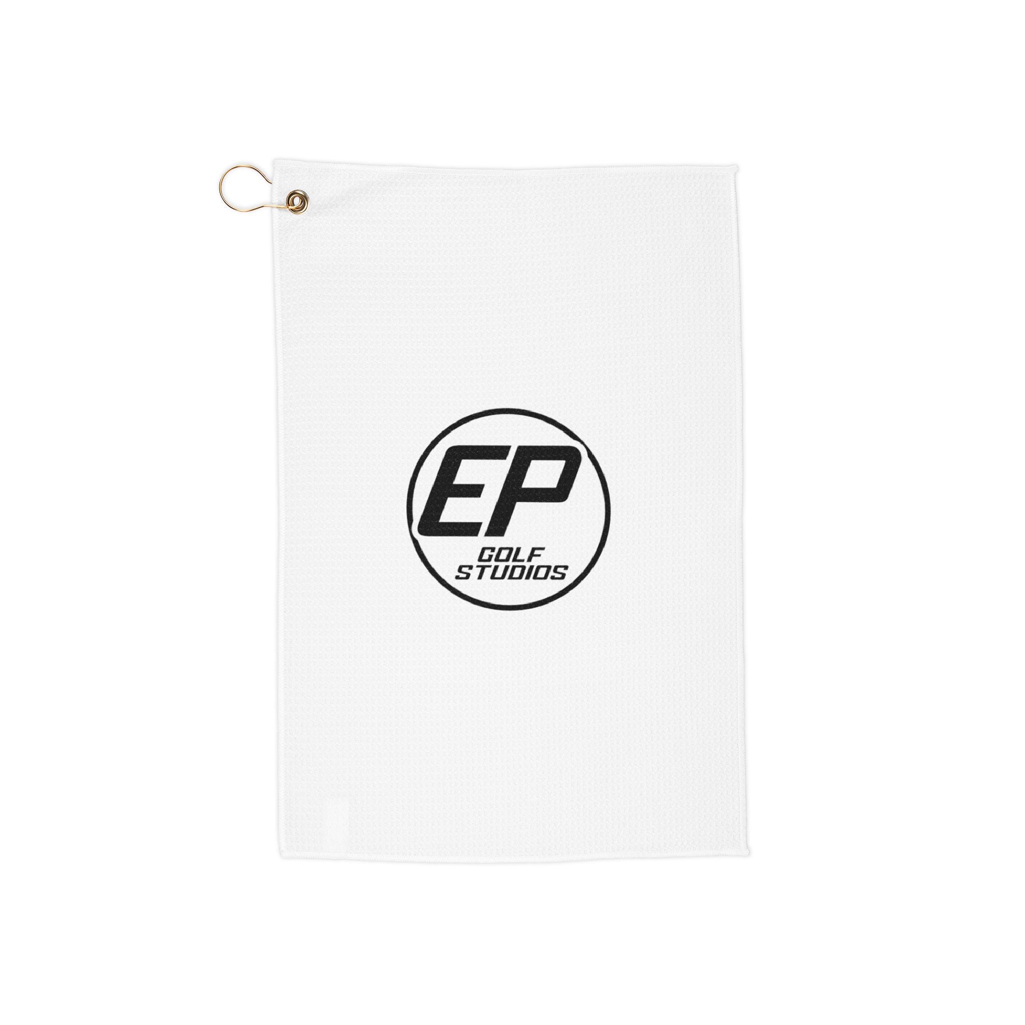 EP Golf & Studios Logo Golf Towel — White Microfiber Towel with Grommet & Hook