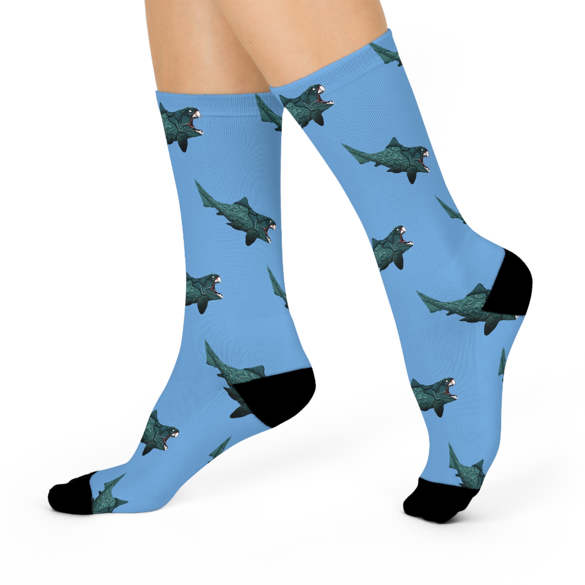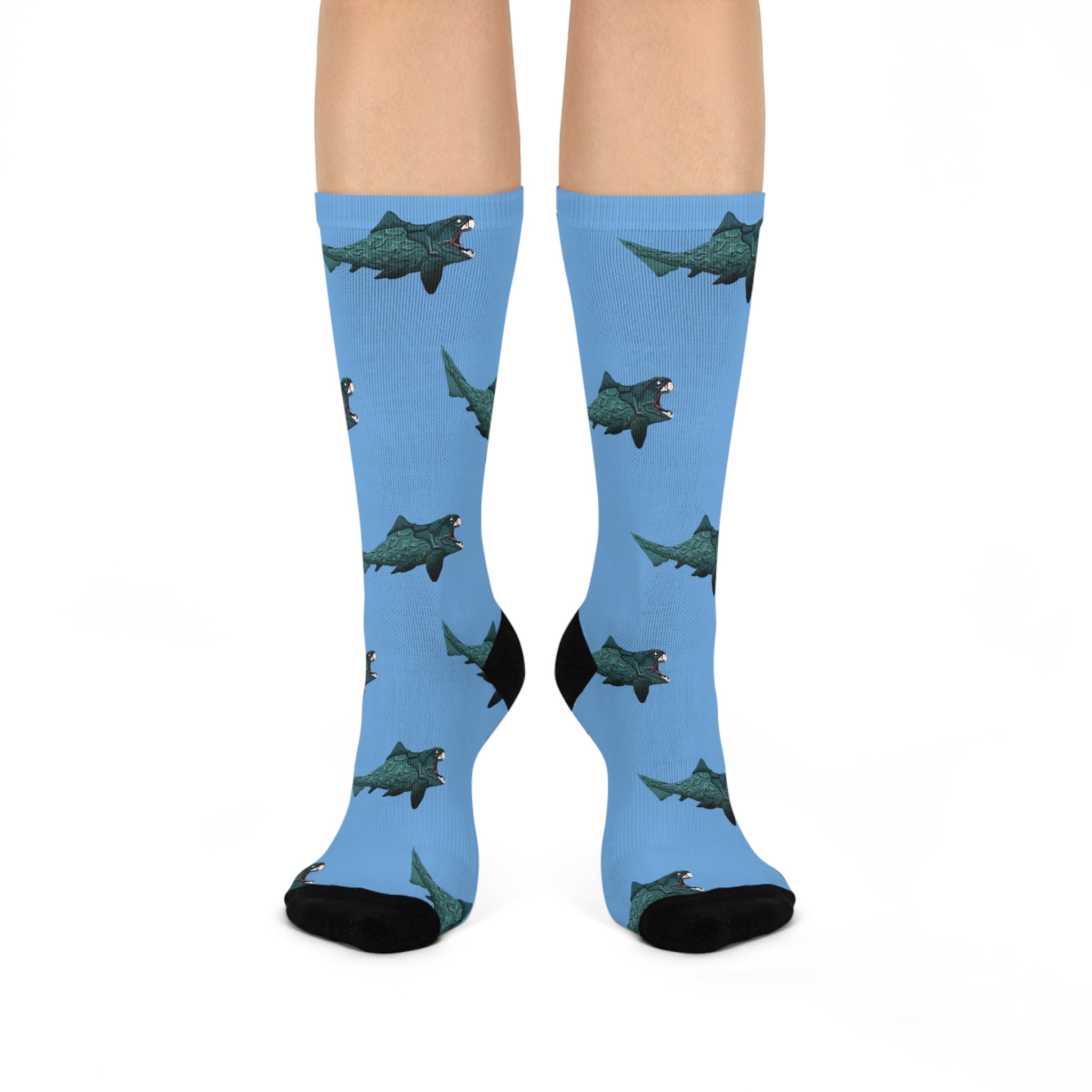 Shark Pattern Crew Socks — Blue Cushioned Socks with Repeating Shark Design